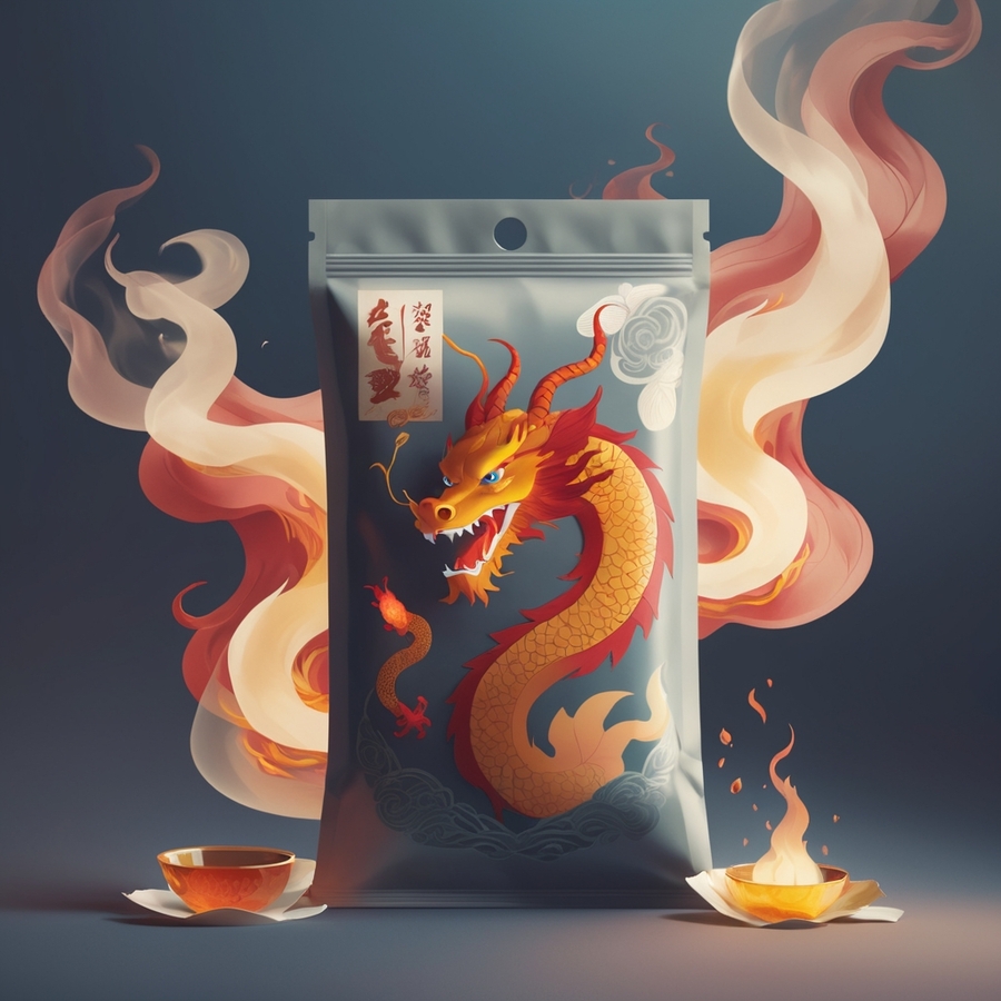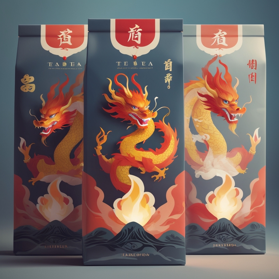 Промпт — Chinese tea packages design as mockups with Chinese dragons illustration on them in a simple style dreamy vibe red Chinese dragon portrait is exhaling fire breathing fire tea bags