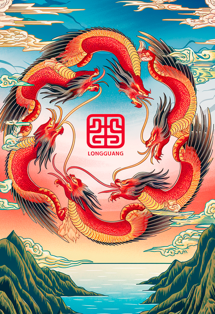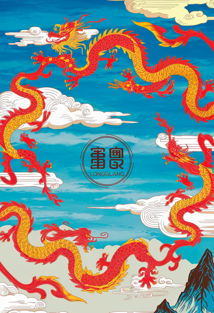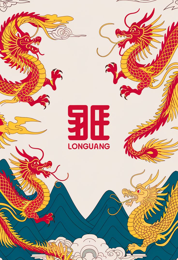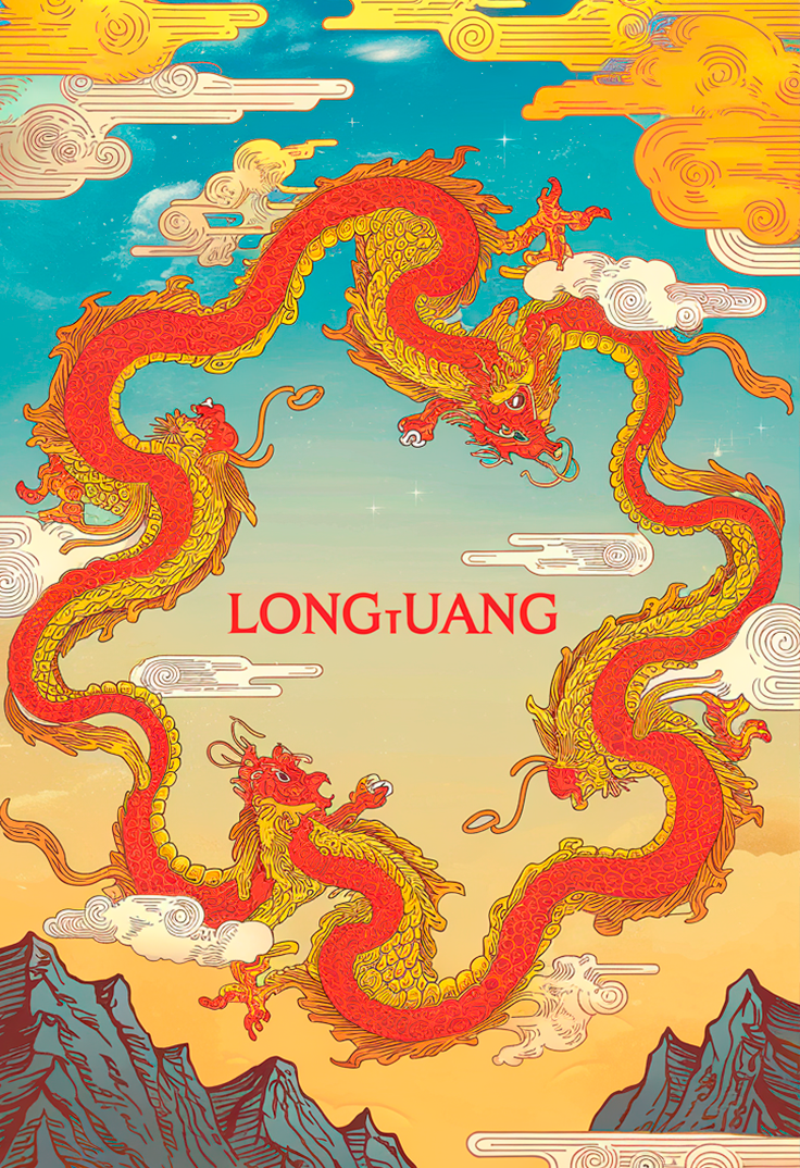 Промпт: Chinese dragons illustration-poster commercial in a simple style dreamy vibe red and yellow Chinese dragons are flying in circle among the clouds and there are mountains below them «Longguang»