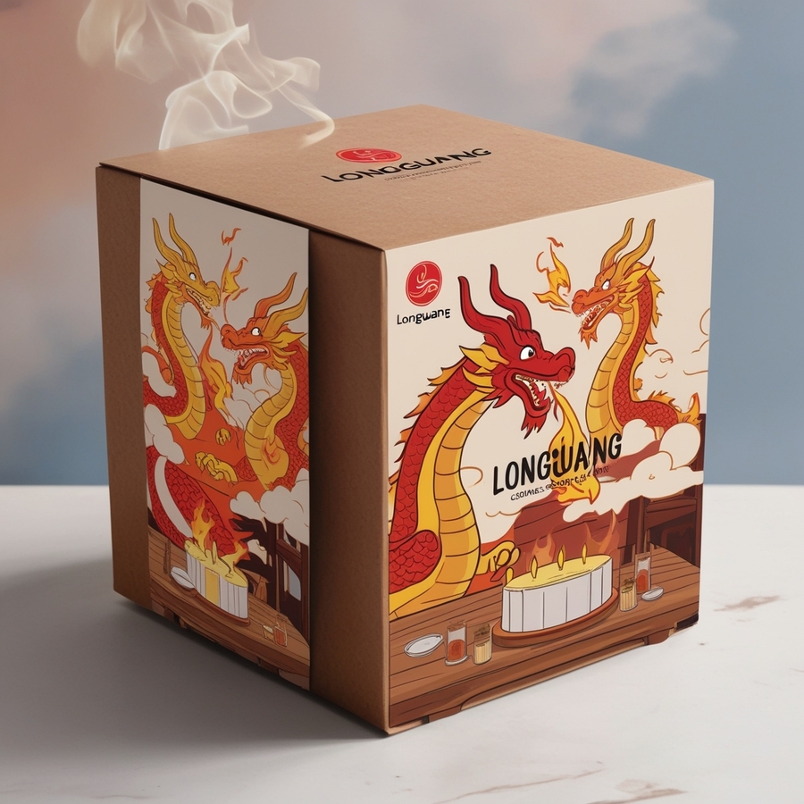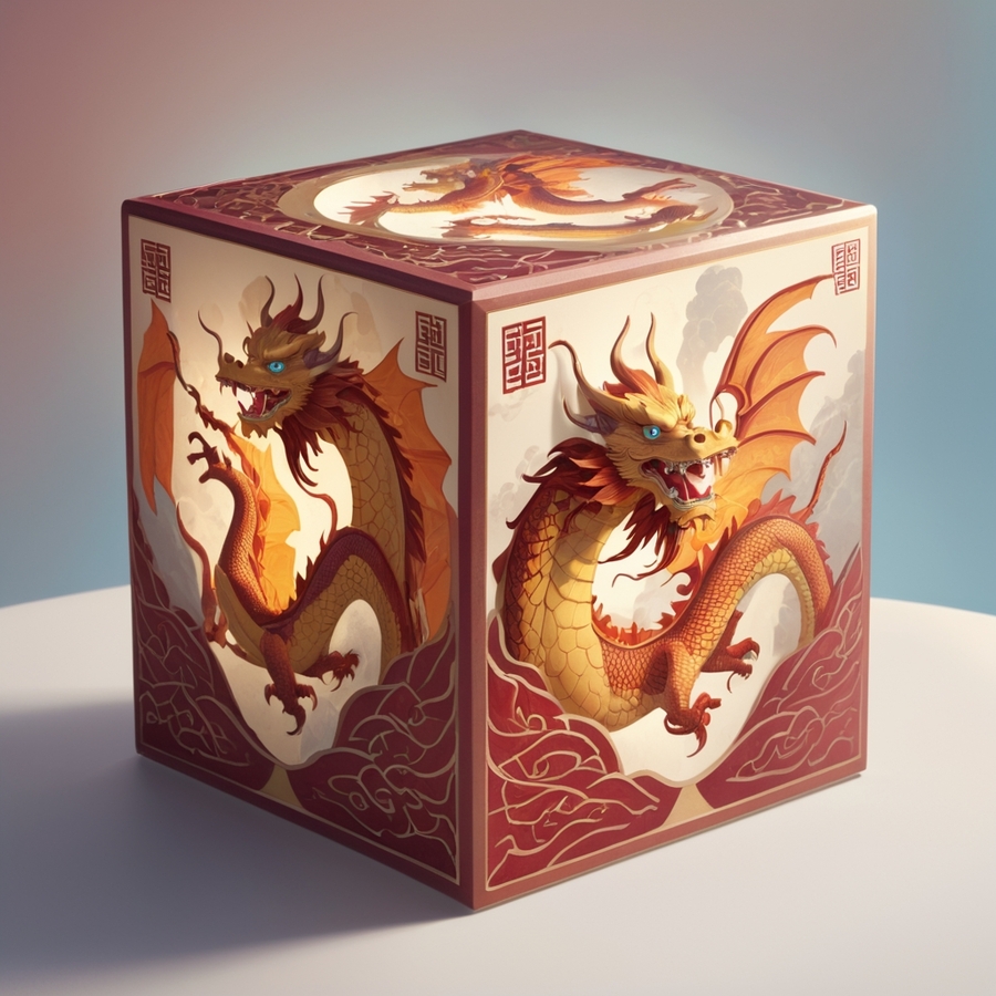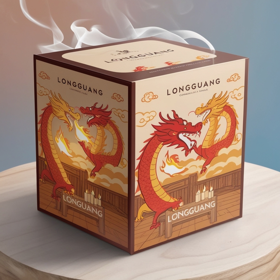 Промпт: a big cube package for company «Longguang» that makes candles in a form of Chinese dragons. On the front part of a cube package there is a chinese dragons illustration commercial