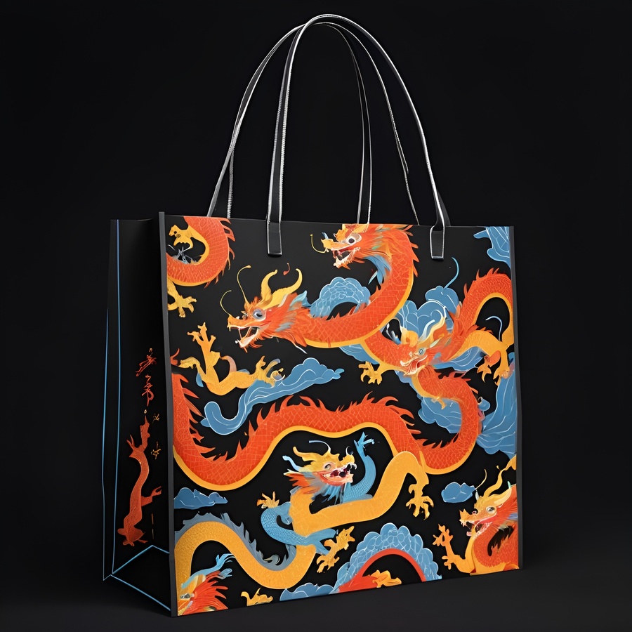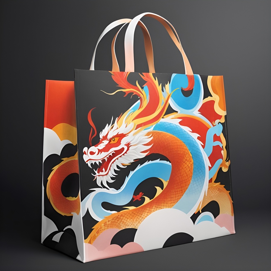 Промпт: Create a white shopper with a Chinese dragons simple minimalistic red orange yellow and blue sky illustration on the black background