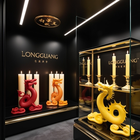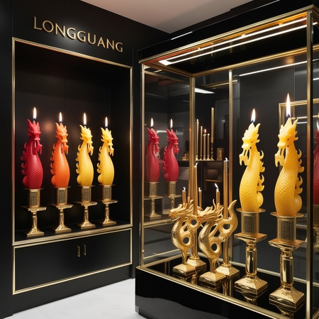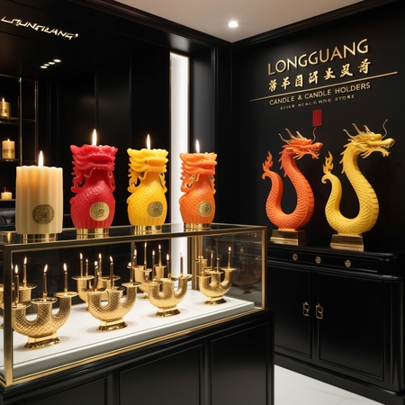 Промпт: Create an authentic realistic very big store selling candles and candle holders called «Longguang» in the shape of red, orange and yellow traditional Chinese dragons.