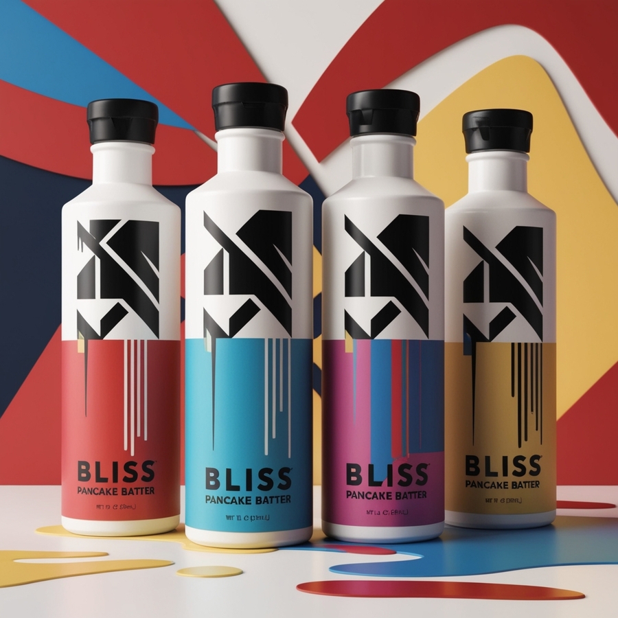 prompt: Create a 3D render of four bottles of pancake batter with a modern, minimalist design influenced by brutalism. The bottles feature a bold, geometric «Bliss» logo in black and white, with abstract, distorted lettering. The labels are sleek, with sharp lines and a high-tech feel, while the overall look is strong, contemporary, and creative. The background should be an abstract blend of vibrant red, blue, and yellow, providing a dynamic contrast to the minimalist design of the bottles.