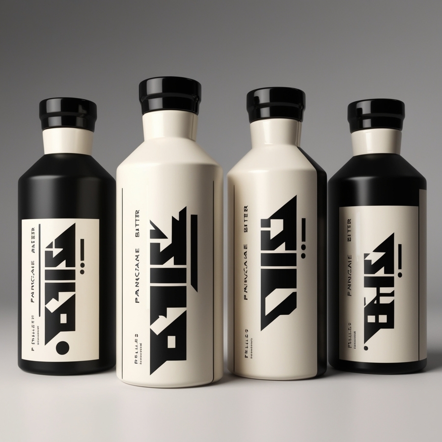prompt: Create a product design for a bottle of crepe batter branded as 'BlinnBliss, ' a modern café known for unique, creative crepes. The bottle should be sleek and minimalist, incorporating bold, brutalist elements with thick lines and geometric shapes in a black-and-white palette, possibly with one accent color. The label should display the 'BlinnBliss' logo in a clear, legible way, using abstract shapes or line art that hints at crepes or batter. The overall look should be clean, eye-catching, and reflect the café's innovative, urban, and slightly retro-futuristic aesthetic
