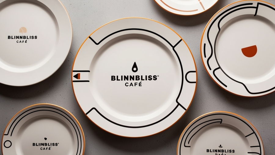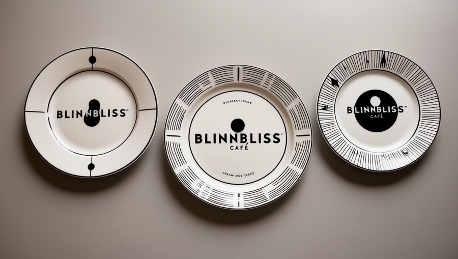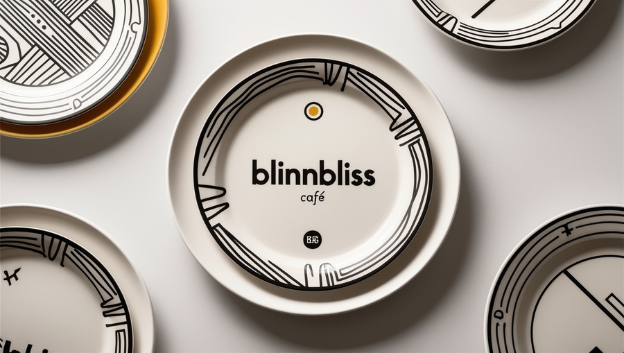 prompt: Design a set of plates for 'BlinnBliss' café, featuring a minimalist, brutalist aesthetic that aligns with the brand’s modern and creative identity. The plates should be predominantly white or neutral, with bold, geometric patterns or line art in black and an optional accent color. Integrate the 'BlinnBliss' logo in a subtle, elegant way, possibly around the rim or at the center, and add small, abstract motifs that evoke the shapes of crepes or fillings. The overall design should be clean, striking, and visually cohesive with the café’s unique retro-futuristic and innovative style.