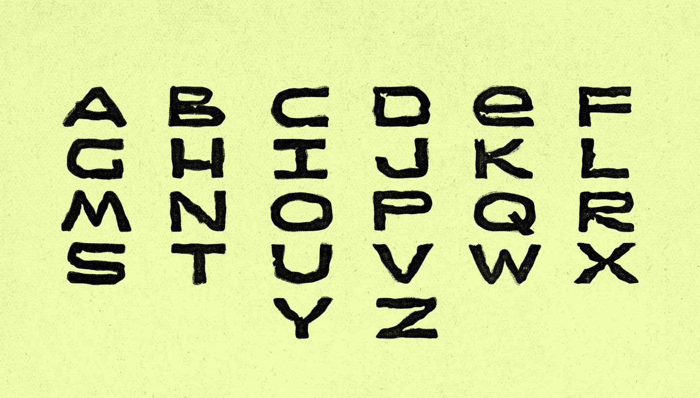 Сначала шрифт создавался вручную: резьба по ластику, штемпельная подушка с гуашью и тушью, оттиск на бумаге. Затем — цифровой отбор: трассировка, сравнение, выбор формы каждой буквы.