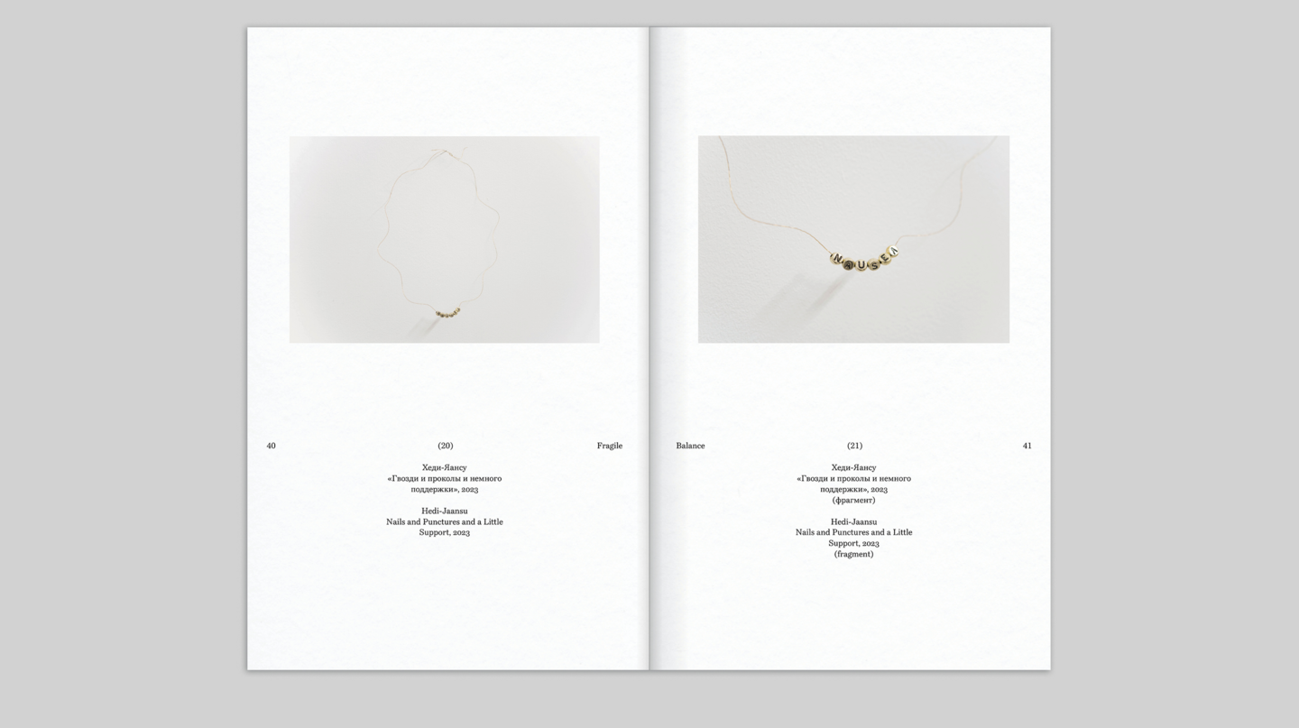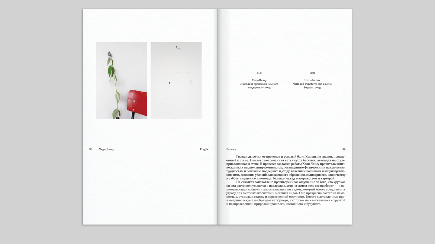 Концепция каталога основана на хрупком балансе между текстом и изображением. Равновесие то создается, то разрушается, перемещается в горизонтальной плоскости и в вертикальной. Идею баланса поддерживает центральная выключка, а также линия колонтитула разбивающая страницу на поля для визуальной и текстовой информации. В оформлении книги акцент делается на обилии текстур.