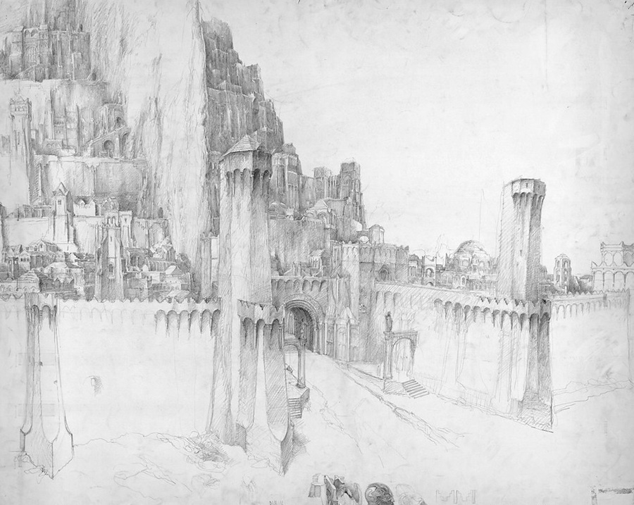 Зарисовки художников-постановщиков стали основой архитектурного мира Минас Тирит — не просто иллюстрациями, а аналитическим инструментом проектирования. Наиболее выразительная из цветных композиций — «Осада Минас Тирит» Джона Хоу — показывает город как светлый каменный бастион на фоне развернувшейся битвы. Здесь подчёркнута вертикальность башен, плотность застройки и сложная структура городских ярусов, визуально усиливающих ощущение неприступности и сакральности.