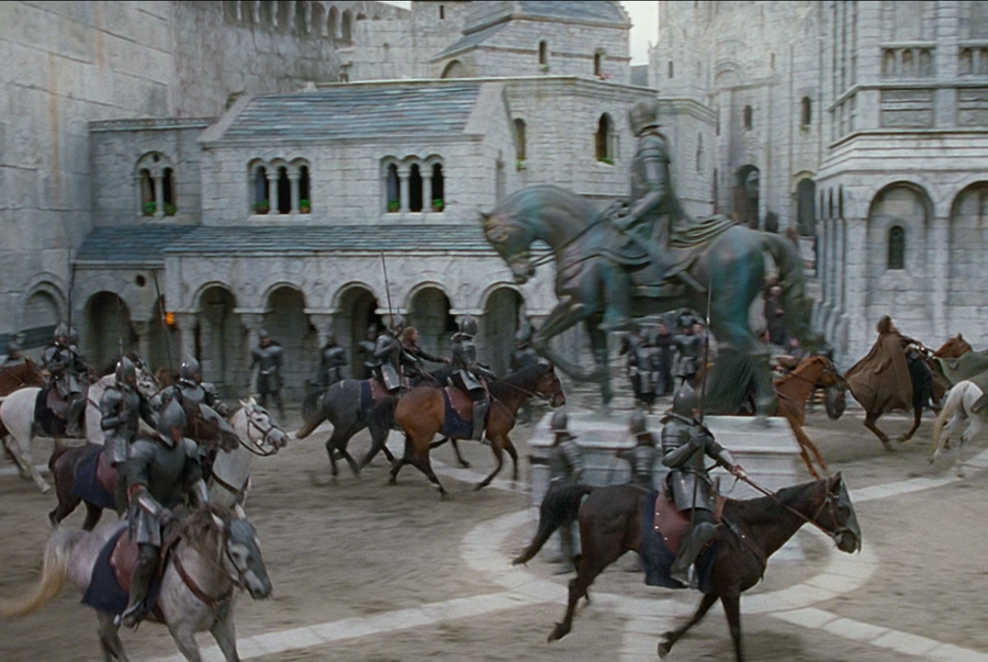 Вступая в ворота Минас Тирит, зритель сталкивается с величественным конным монументом, установленным на высоком постаменте перед первым ярусом городской террасы — прямая отсылка к традиции ренессансных конных статуй, таких как конная фигура Маркуса Аврелия на Капитолийском холме в Риме (копия работы IV в. и возрождённая в XVI в. под руководством Микеланджело), где соединение массивного пьедестала и динамичного силуэта всадника символизирует военную мощь и легитимность власти. В Минас Тирит монумент выступает архитектурным «фланкером» входа: установленный на обработанном блоковом постаменте из порфира, он задаёт ритм и ось подъёма к последующим уровням города.