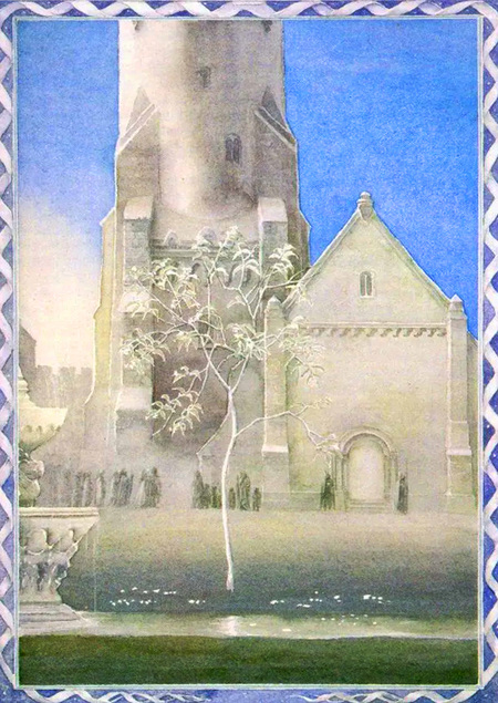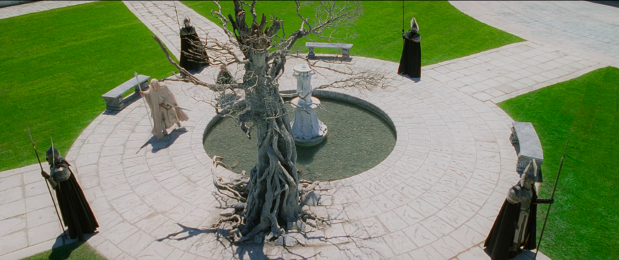 Архитектурная композиция напоминает монастырский клуатр: открытый прямоугольный двор, окружённый аркадами и обращённый к фасаду базилики, где фундаментальный «крест» мощения акцентирует центральность Древа. Фонтан у подножия усиливает мотив очищения и обновления. В фильме Древо показано светящимся и почти нематериальным, что визуализирует утрату и ожидание возрождения — аллегорию возвращения короля и восстановления порядка.
