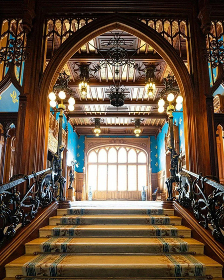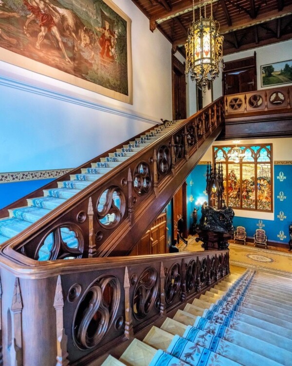 Оформление парадной лестницы — «рыбий пузырь», орнамент, состоящий из четырех комбинаций. Из готических элементов лепнина, которая подчеркивает стрельчатые арки, стрельчатое огромное окно с орнаментом «рыбий пузырь», четыре трехлопастные арки.