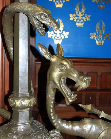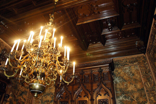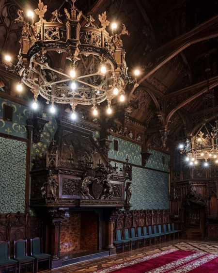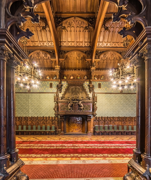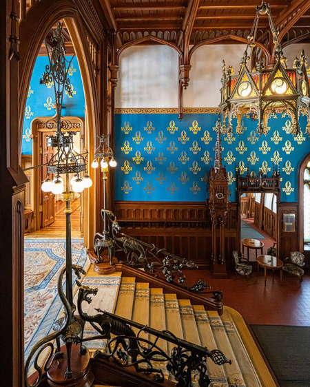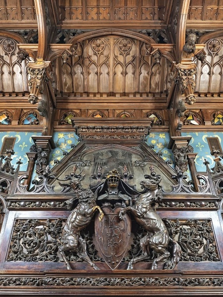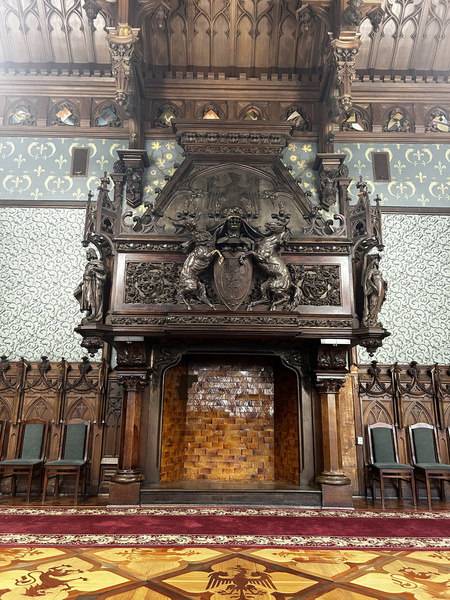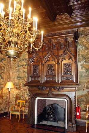 Камин объединяет ренессансную форму и готический верх с фиалами и краббами. По обе стороны размещены небольшие ниши с балдахинами, в которых представлены изображения человеческих фигур. Центральная панель каминной полки имеет сложную орнаментику и включает герб с животными, олень и носорог, которые поддерживают щит с изображением буквы «К». Над композицией расположен геральдический орёл характерного германского типа. Такое сочетание подчёркивает немецкие культурные корни владельцев и формирует цельный символический слой в интерьере.