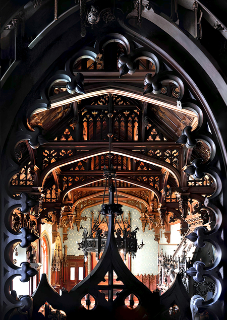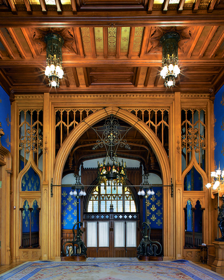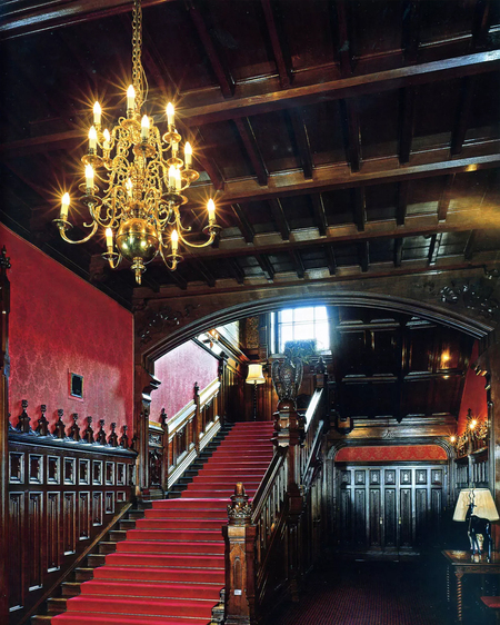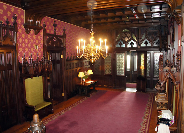 Готические мотивы проявляются уже в экстерьере, ризалит с замковым завершением, машикулями и башнями напоминает позднеанглийские церковные фасады. Стрельчатые арки и перспективные порталы усиливают это впечатление.