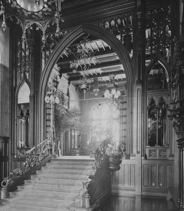 Парадный вход предстает как ячейка готического собора, перекрытая нервюрными веерными сводами английского происхождения. С трех сторон арки для подъезда, перспективные порталы фланкированные контрфорсами, которые не имеют конструктивного смысла, а лишь играют роль стилизации чтобы усилить готическое настроение.