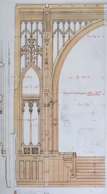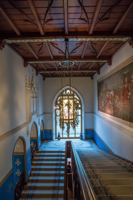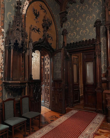 Витражное окно со стрельчатым заполнением и контрфорсами продолжает тему готического фасада и в интерьере. При этом, если вестибюль симметричен, то аванзал построен на асимметрии дверей и арок. Это сочетание симметрии и асимметрии делает интерьер живым и драматичным, подчёркивая модерновую свободу планировочных решений.