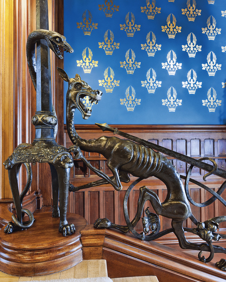 Лестничное ограждение — готическая химера, атакуемая копьём, и змея, сползающая по торшеру, задают мрачный символический тон. Посетитель, входя в дом, сразу видит этих монстров на фоне витража. Здесь Шехтель работает уже как символист, движение от чудовищ к свету в аванзале становится частью драматургии интерьера.