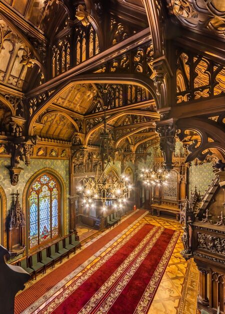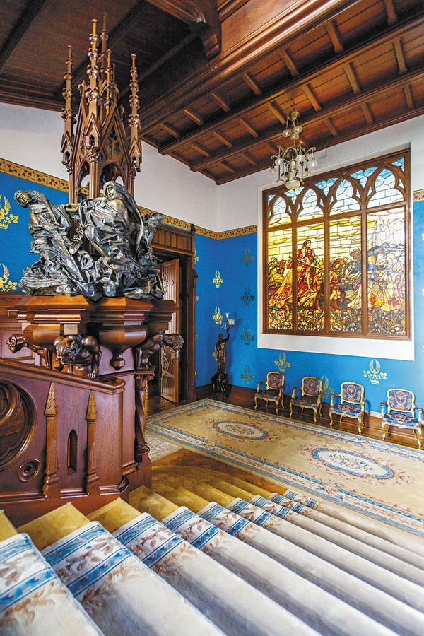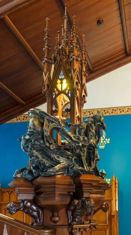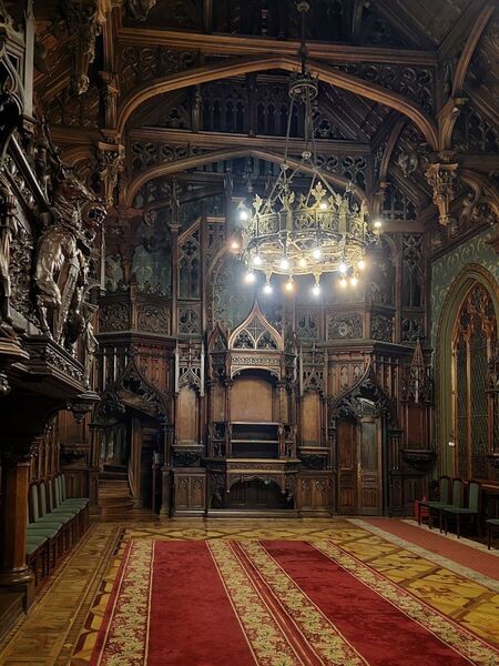 Наиболее характерной деталью является открытая конструкция двускатной крыши. внутренние плоскости скатов покрыты орнаментом, а фермы и стропильная система имеют почти «кружевную» проработку. Дополнительный декоративный слой создают многочисленные подвесные готические кулоны. Потолок визуально разбит на пять продольных секций, центральная занята эркером.