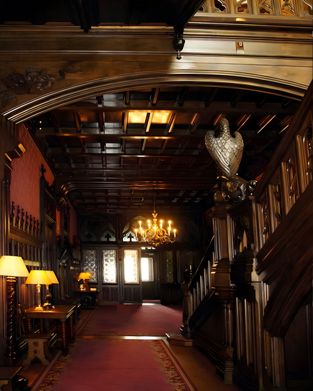 В холле по обе стороны размещены подлинные гобелены, дополненные резными капителями, за счёт этого пространство сразу воспринимается как стилизованный средневековый зал. Паркет собран из ценных пород древесины и выложен сложным ромбовидным узором с крупным кругом в центре.