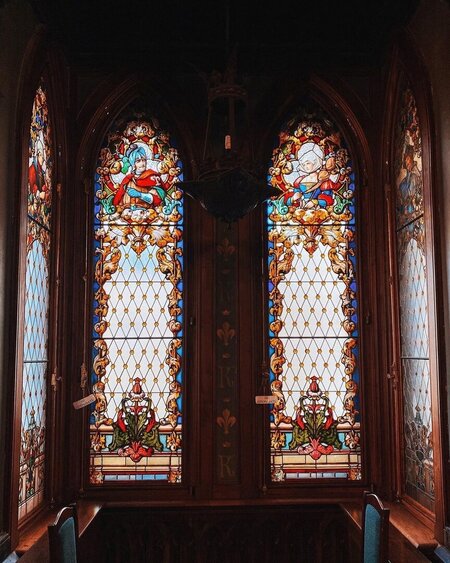 Витражи особняка Кельх отличаются высокой художественной проработкой и визуальной насыщенностью. Декоративное оформление нижних панелей опирается на мотив двойной аркады, типичный для английской готической традиции.