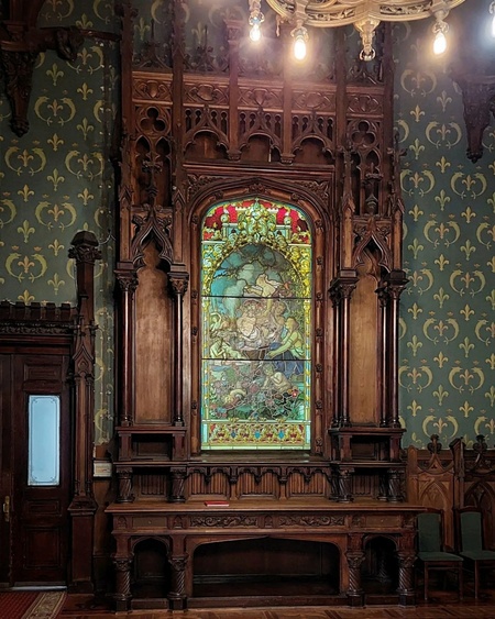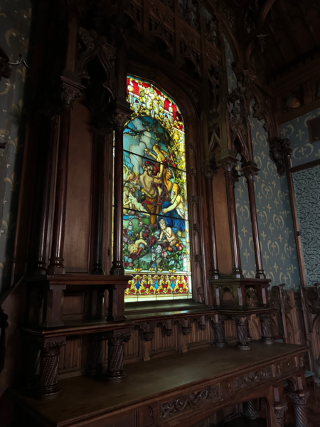 В эркере помещён сюжетный витраж с изображением дамы и рыцаря, композиция строится на лёгком развороте фигур друг к другу без прямого взаимодействия, что соответствует традициям средневековья. Окружающий орнамент состоит из акантовых завитков мягкого, почти барочного рисунка.