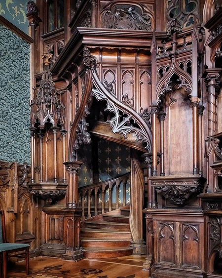 На площадке второго этажа готические реминисценции проявлены особенно явно. В оформлении дверного портала выделяется крупный фиал над килевидной аркой. На двери заметен мотив «льняных складок», типичный для позднесредневековых орнаментальных схем. Камин напоминает средневековые образцы из жилых домов, его трёхчастная композиция ориентирована на структуру складней и триптихов.