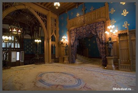 Рыцарский зал. Зал, посвященный рыцарской теме, демонстрирует еще одну грань реминисценций. Здесь готика становится декорацией для романтической идеи о доблестном прошлом. Витражи, гобелены и атрибутика создают целостный образ, более театральный, нежели исторически достоверный.