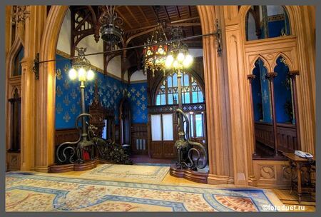Малая гостиная (Готическая). Это помещение — концентрация готического духа. Резной камин из светлого камня, стрельчатые зеркала в золоченых рамах, мебель с готическими шипами и витражи создают изысканную и в то же время интимную обстановку.