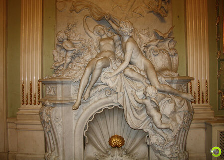 Большая гостиная. Помещение отличается изысканностью отделки. Белые стены с золоченой лепниной готического рисунка (крестоцветы, трилистники) сочетаются с темным паркетом. Камин из белого мрамора с резным стрельчатым фронтоном является композиционным центром.