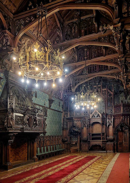 Готический кабинет. Это одно из самых знаменитых интерьерных произведений эпохи. Все пространство, от пола до потолка, покрыто резьбой по темному дубу. Сложнейший орнамент, включающий как традиционные готические элементы (розетки, трифолии), так и персонажей средневековых бестиариев (химер, горгулий), превращает комнату в единое произведение искусства.