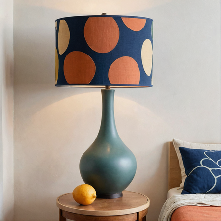 Prompt: Create a lampshade inspired by henri matisse’s cut-outs in deep indigo, warm terracotta, muted ivory, soft sage green, ochre yellow, and dusty coral. patterns should feature bold organic shapes and abstract forms—in a balanced, artful composition. use soft natural lighting and a neutral backdrop to highlight the fabrics’ artisanal texture and vibrant, mediterranean character.