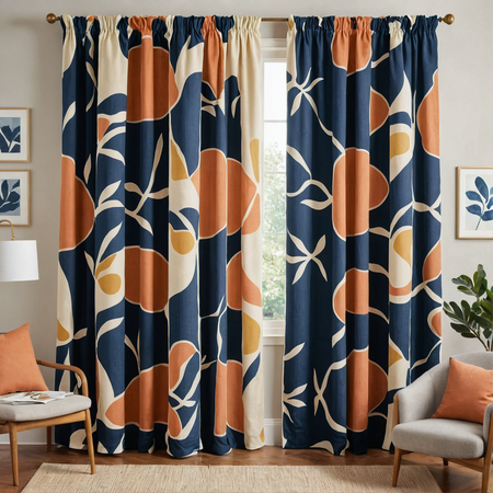 Prompt: Create patterned curtains inspired by henri matisse’s cut-outs in deep indigo, warm terracotta, muted ivory, soft sage green, ochre yellow, and dusty coral. patterns should feature bold organic shapes and abstract forms—in a balanced, artful composition. use soft natural lighting and a neutral backdrop to highlight the fabrics’ artisanal texture and vibrant, mediterranean character.