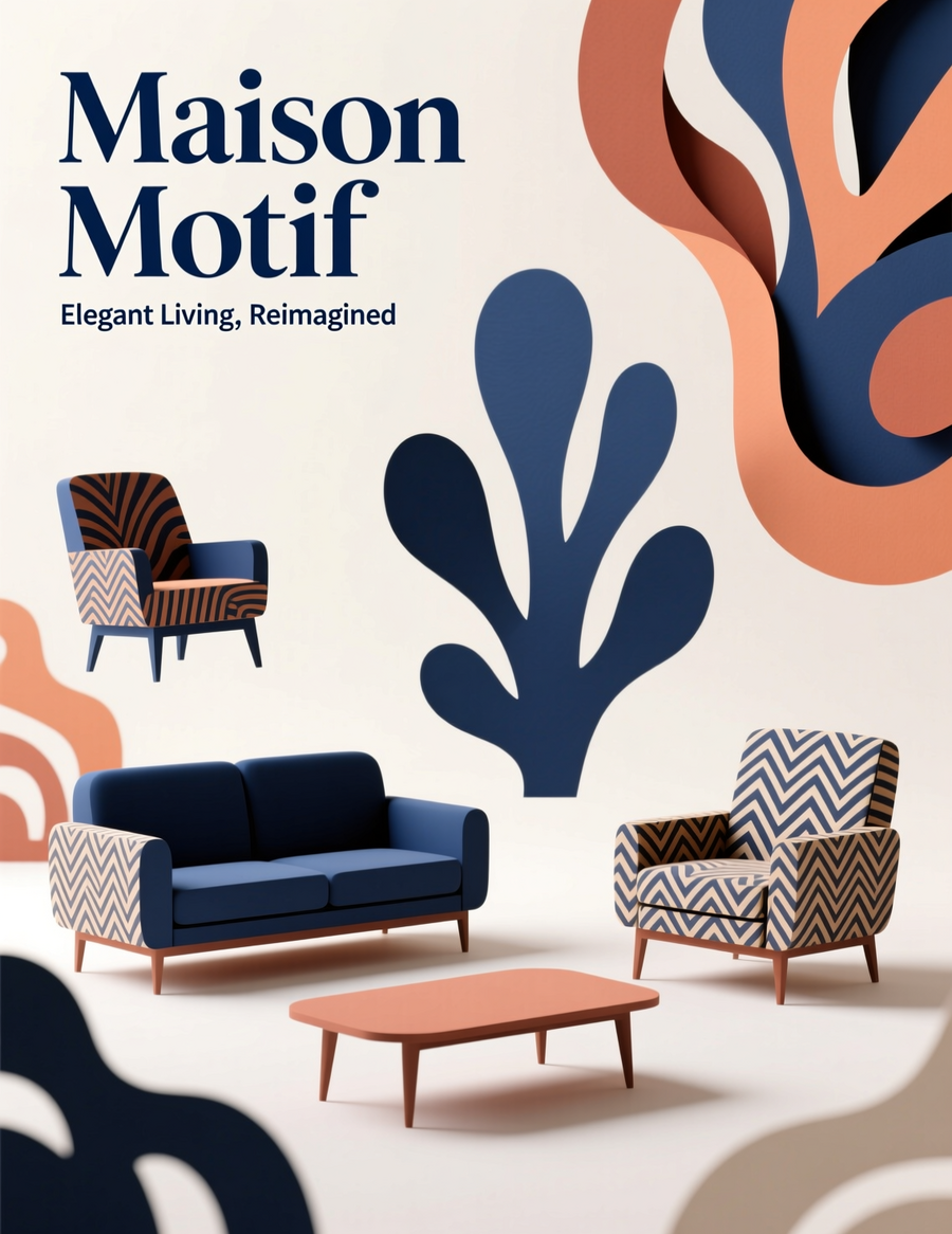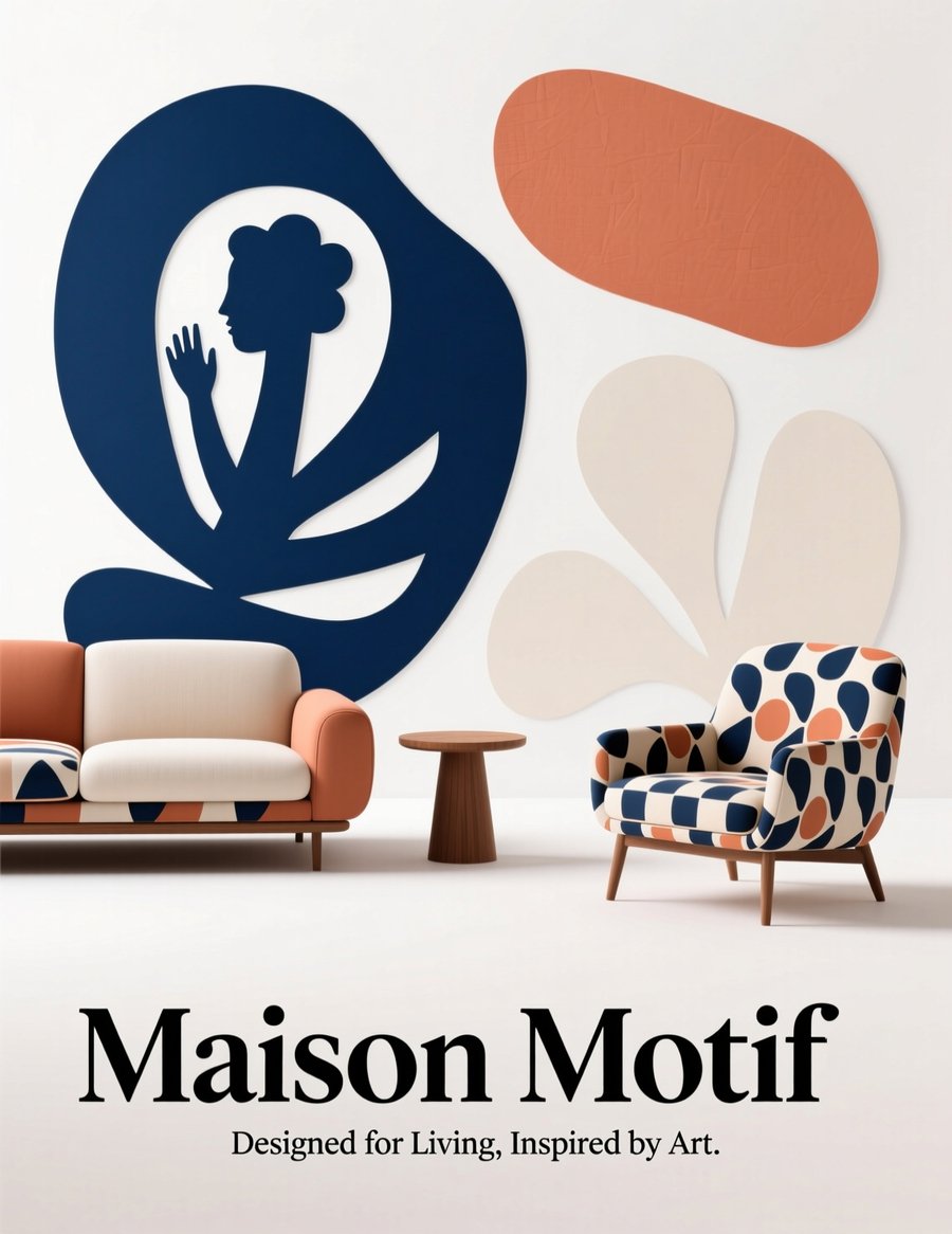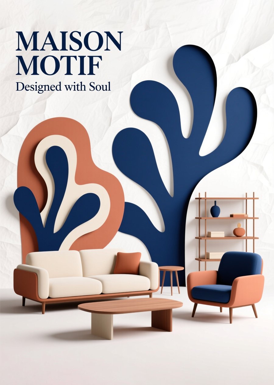 Prompt: Create an elegant poster for a furniture brand Maison Motif, showcasing different furniture, that has distinctive patterns inspired by henri matisse’s cutouts. feature abstract and organic shapes and bold patterns in deep indigo, warm terracotta, and muted ivory. use clean typography, generous white space. The overall look should feel sophisticated, modern, and vibrant, evoking the spirit