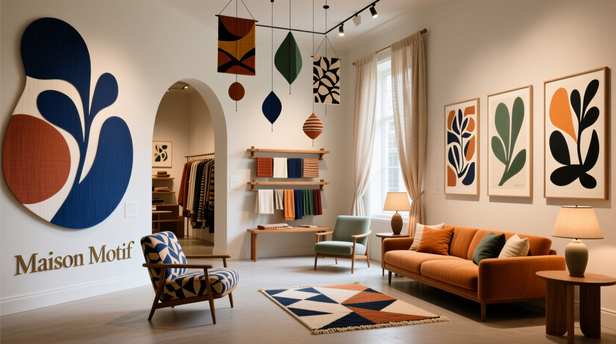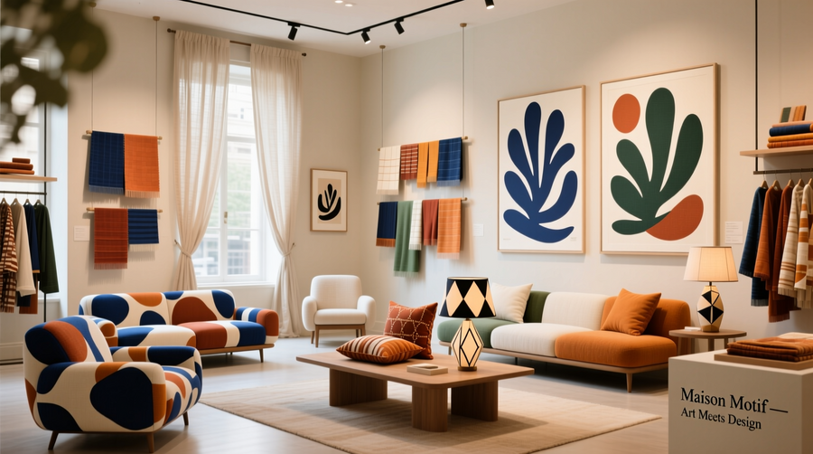 Prompt: Design the interior of Maison Motif, a boutique furniture and textile atelier inspired by Henri Matisse’s cut-out art. The shop should feel artistic, modern, and inviting, featuring furniture pieces upholstered in bold patterned fabrics and textile displays in indigo, terracotta, ivory, sage, and ochre. Include soft natural lighting, neutral walls, and art prints or fabric panels as décor. The space should blend gallery-like elegance with warm, handcrafted charm, expressing Maison Motif’s fusion of art, pattern, and design.