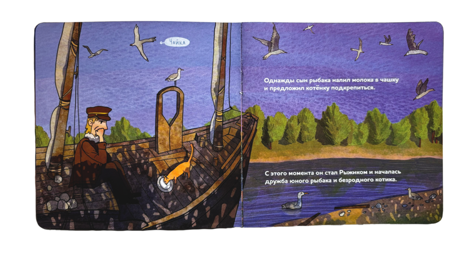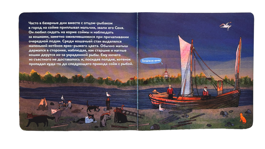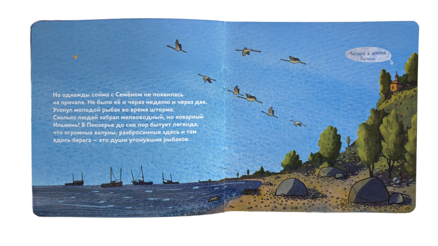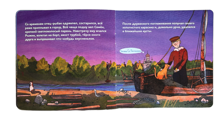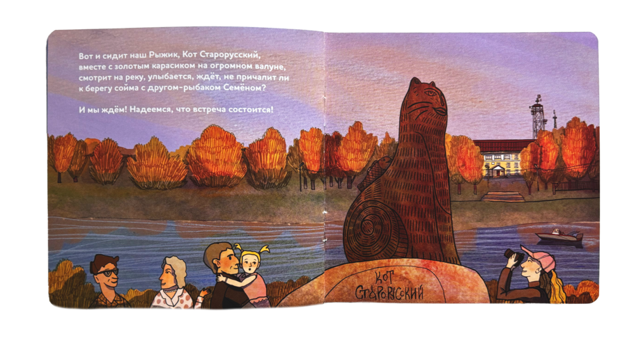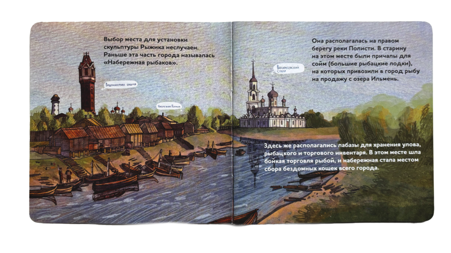 В итоге получилась не только милая история о дружбе кота Рыжика и рыбака Семена, но и некая энциклопедия по городу, знакомящая нас с архитектурой и достопримечательностями Старой Руссы и ее окрестностей. На одном из разворотов, перемещающих нас уже в настоящее время, изображены озеро Ильмень, деревня Пустошь и Ильменский глинт, многовековой памятник природы.