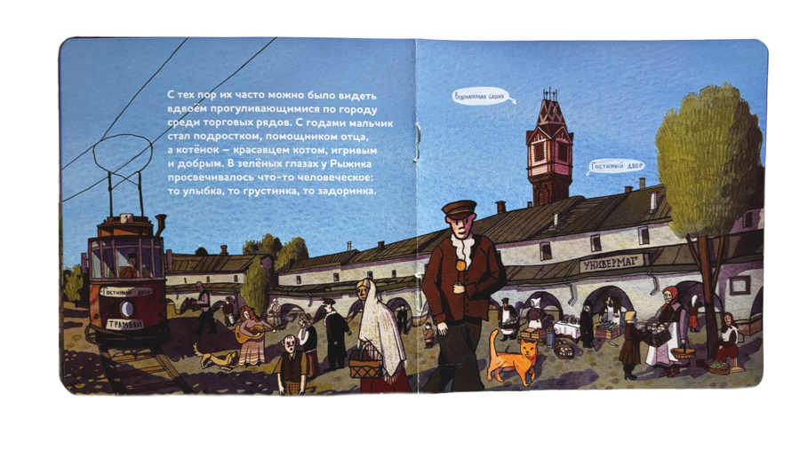 Передо мной стояла задача не только познакомить читателя с Рыжиком и его историей, но и показать город с исторической точностью, передать дух времени. На многих иллюстрациях изображены те здания, церкви, учреждения, которые уже не существуют. Я изучил атмосферу уездных городов того времени, одежду людей, их занятия и быт, чтобы использовать весь этот материал в иллюстрациях.