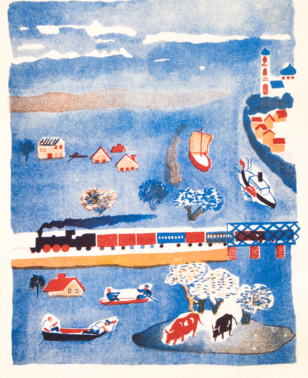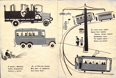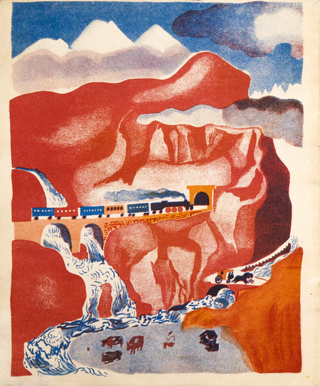 Тема железной дороги была очень популярной в 1920-е годы, к ней часто обращались и писатели, и художники. Книжка «Поезд» устроена так, что текст играет роль короткого вступления и заключения, а главное действие рассказывается через иллюстрацию, где каждая картинка — отдельная вселенная со своим набором действий и сюжетов. Поезд, как главный герой, проходит через все развороты и становится ритмическим центром, который связывает разные сюжеты: пустыню, джунгли, мегаполис, горные ущелья, восточный город.