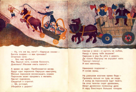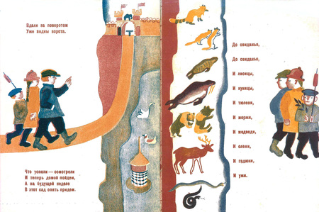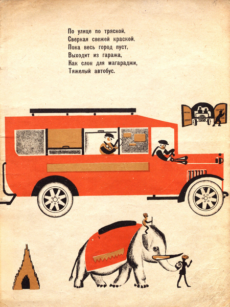 Одна из книжек, созданных Ермолаевой в паре с Львом Юдиным, русским авангардистом. Можно заметить, что сам подход к иллюстрации начинает немного меняться. Теперь цвет у художницы приобрел большее количество оттенков и плоскостей.
