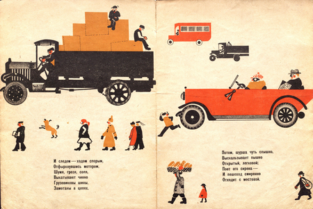 Вся книжка образует единую живописную и пластическую структуру. Неоднородные, неожиданные от страницы к странице композиции и обрывистые линии погружают нас в суету и движение городских улиц. В этой книге хорошо видно, как художники 20-х годов, и сама Вера Ермолаева, видели мир — в динамических ракурсах, сдвигах, столкновениях и движении. Цветовое решение, выбранное художницей, очень близко супрематистским композициями — черные, красные цветовые плоскости на белом. В целом, вся композиция построена на линиях — они могут пересекаться или иметь разное направление — но общий образ складывается всё равно.