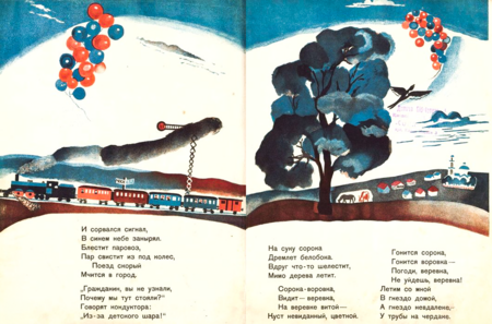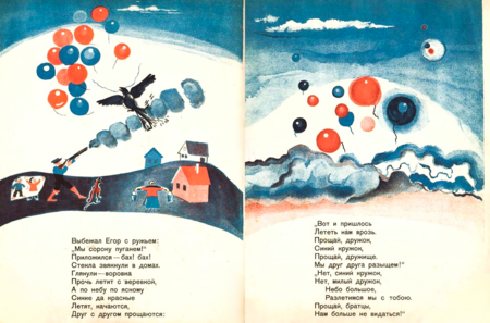 На мой взгляд, одна из лучших детских книжек, исполненных Верой Ермолаевой. Все иллюстрации в этой работе живут в плоскости трёх цветов — синий, красный и белый. «Гениальная простота решения. Не нужно многоцветия, чтобы получилось не просто ярко, а необычайно красиво и изысканно» [2, стр. 11]. В этой книжке иллюстрация управляет и текстом, и книжным разворотом. Текст подчинён траектории полёта шариков, то поднимаясь вверх по диагонали, то сгущаясь плотным вертикальным набором, создавая единое действие, где образ и слово неразделимы.
