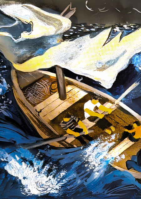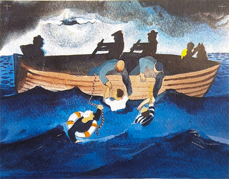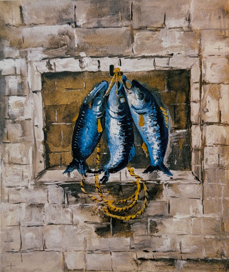 В 1928 и 1930 годах Вера Ермолаева путешествовала к Баренцеву и Белому морям и жила в рыбачьем посёлке. Именно в этот период станковая графика Ермолаевой становится импульсом к созданию гуашей, благодаря которым вместе с Введенским были придуманы «Рыбаки». В этой серии особое внимание хотелось бы уделить цветоощущению Ермолаевой. Захлёстывающее столкновение линий и глубокий синий цвет очень точно передают особый ритм жизни рыбаков. Иллюстрации наполнены драматизмом и, на мой взгляд, работают даже как отдельные композиции, которые могут быть просмотрены и вне книжного разворота.