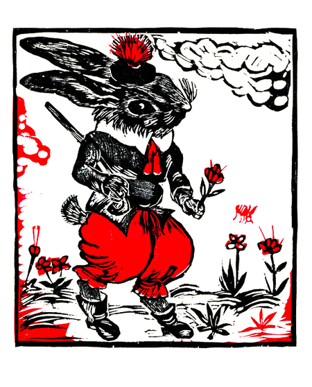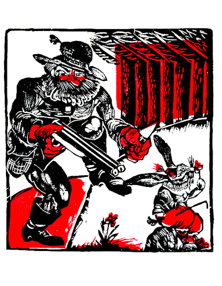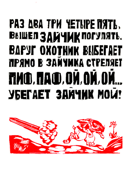 Каждый новый разворот повторяет композицию предыдущего — на левой странице по одной строчке текста, а на правой — к этой строчке даётся рисунок. Крупные силуэты охотника и зайца составлены из «рубленых» линий, с подчеркнутой фактурой штриха. Сами по себе композиции очень динамичные: заяц то нарядный, «человеческий», в шароварах и шляпе, то комически маленький рядом с массивной фигурой охотника. Иллюстрации, несмотря на небольшое количество цвета, очень драматичны — облака дыма, вспышка, резкие диагонали.