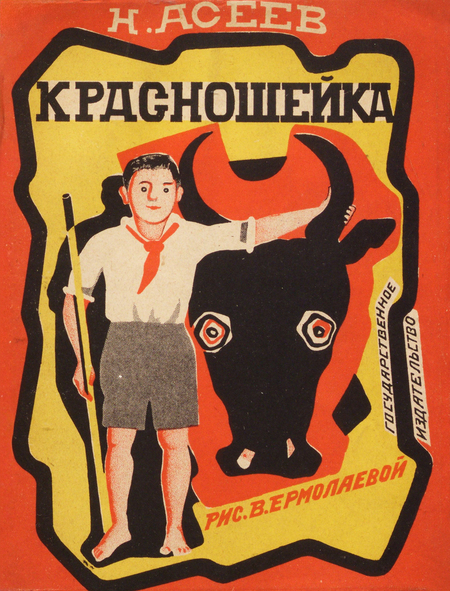 Продолжая говорить о супрематизме, иллюстрации Ермолаевой к «Красношейке» так же построены на резком контрасте чёрного и белого. Рисунки держатся на энергичной линии и крупных пятнах, за счёт чего подчёркивается движение и риск сюжета. 1-я и 4-я стороны обложки используют ограниченную палитру красного, жёлтого, чёрного и серого и напоминают плакат: крупный силуэт быка, фигура пионера и отдельные «кадры» из жизни героя, заключённые в неровные, словно вырезанные контуры. Иллюстрации же внутри книжки чёрно-белые, выразительные, живые, напоминающие наброски или быстрые зарисовки с натуры.