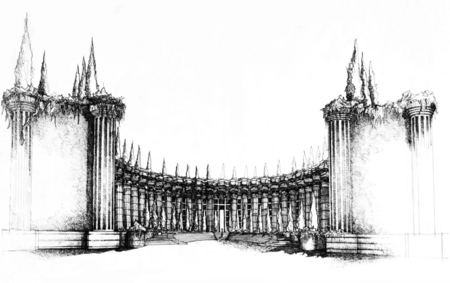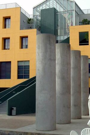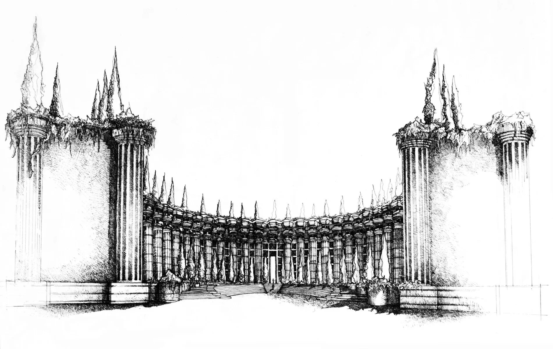 Оголённые бетонные колонны, намеренно лишённые декора и индивидуальности, подаются как монументы. Несмотря на обезличенный и загадочный образ композицииб она передает чувство незыблемости и мощи.