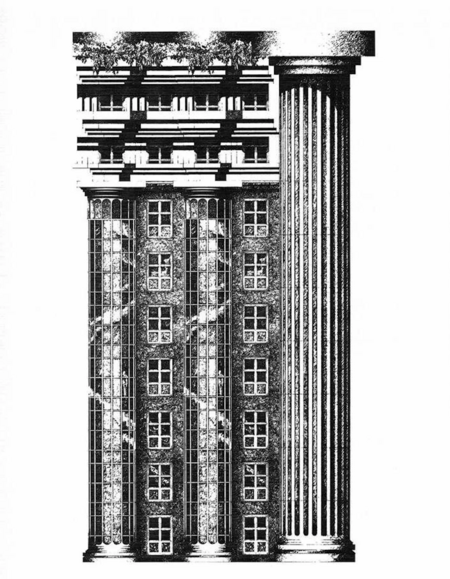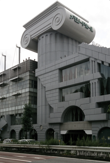 В основе работы Кенго Кума и последующих двух проектов лежит единый приём — гигантизм. Классические ордеры радикально увеличены до размеров многоэтажных сооружений. Колонна лишается приличной функции и существует как декорация, создавая диссонанс между исторической формой и её современной интерпретацией.