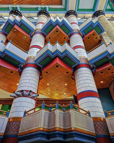В атриуме Кембриджской школы происходит сознательная трансформация архитектурного канона. Массивные колонны, отсылающие к классической архитектуре по своему масштабу и форме, лишены традиционного благородства. Их поверхность покрыта яркими, экспрессивными узорами, которые трансформируют ожидаемую серьёзность университетской среды в динамичную, праздничную атмосферу.