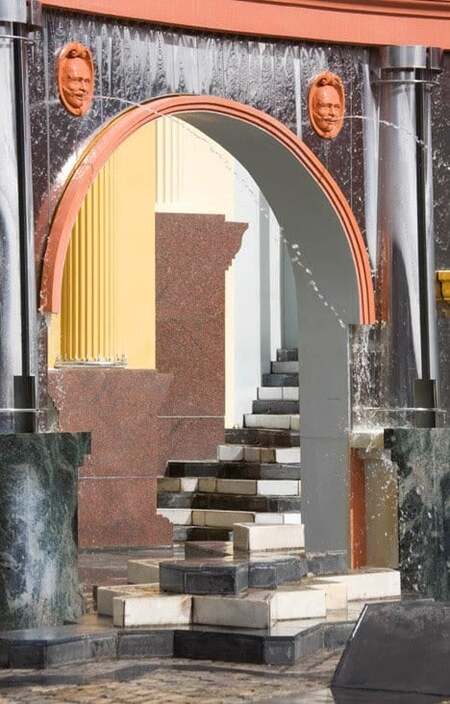 Особого внимания также заслуживает намеренное использование скульптурных лиц, из которых струится вода. Этот приём задаёт всему пространству ироничный тон, трансформируя ожидаемое благоговение перед классикой в лёгкую сатиру или даже насмешку.
