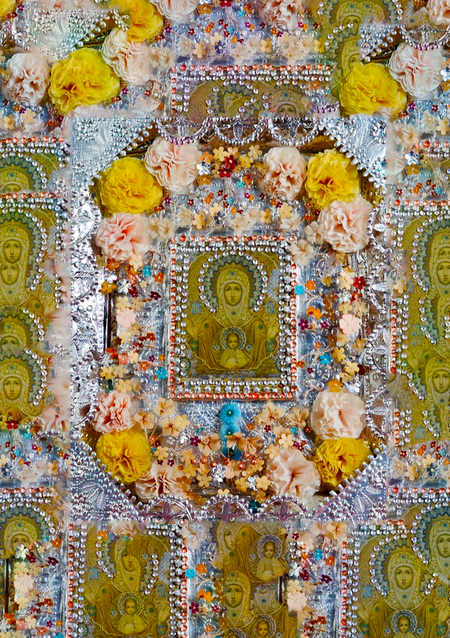 Икона Божьей Матери с окладом из тканевых и бумажных цветов, а также чеканной фольги