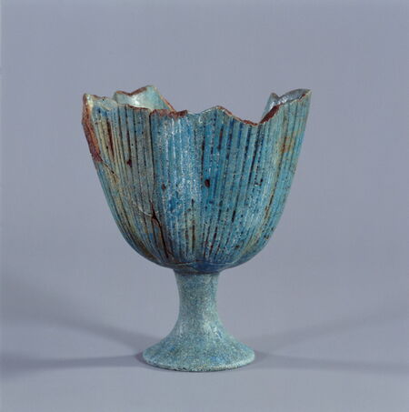 «В Третий Переходный период фаянсовые чаши, форма которых происходила от цветка лотоса, и другие изящные фаянсовые изделия украшались рельефными сценами, отсылавшими к комплексу мифов, связанных с рождением царя как дитя бога солнца в водной среде болот.