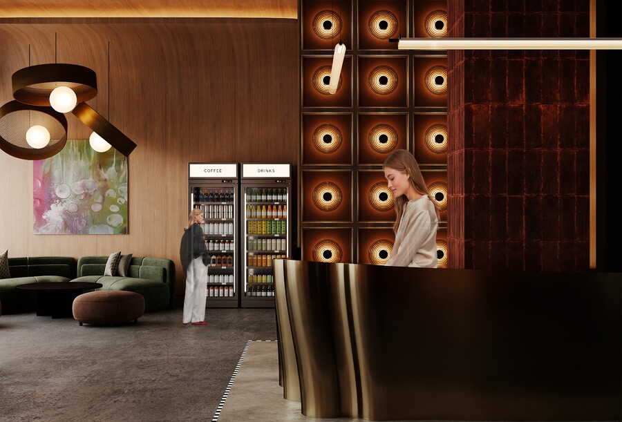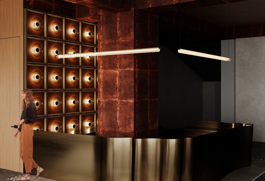 Интерьер общих зон выполнен в стиле индустриального минимализма с использованием бетонных поверхностей, металлических пластов и тёплых материалов.