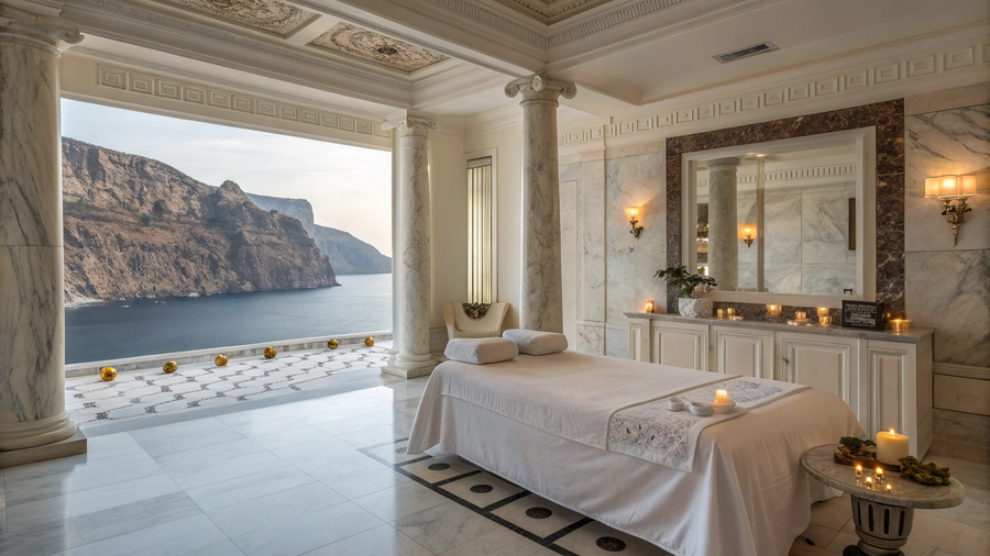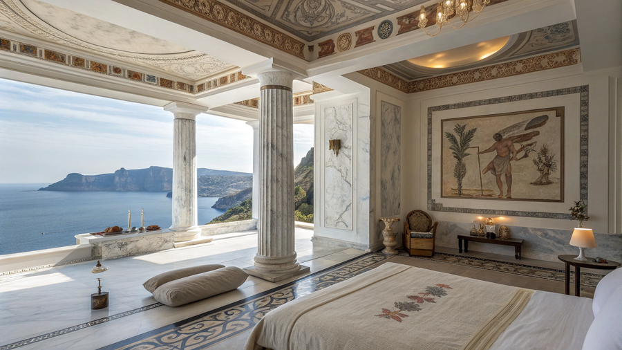 luxury guest rooms for a recreation club inspired by ancient Greek antiquity. The spacious interiors should feature elegant white walls and include essential items for guest comfort, such as a plush bed, a stylish diffuser, and ambient candles. Emphasize a harmonious blend of classical elements and modern luxury. Large windows should offer breathtaking views of the sea and cliffs, enhancing the tranquil atmosphere of the room