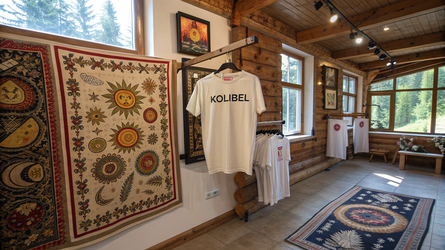 an authentic showroom showcasing trendy club merchandise, beautifully designed in the Old Slavic style. The interior exudes a warm and inviting atmosphere, highlighted by a large, intricately embroidered carpet that adorns one wall, reflecting rich cultural heritage. stylish T-shirts emblazoned with the word 'KOLIBEL' hang neatly on elegant wooden hangers, while vibrant paintings featuring solar symbols add a touch of artistic flair to the space. the showroom is bathed in natural light, thanks to expansive windows that frame breathtaking views of the surrounding forest, creating a harmonious blend of nature and tradition.